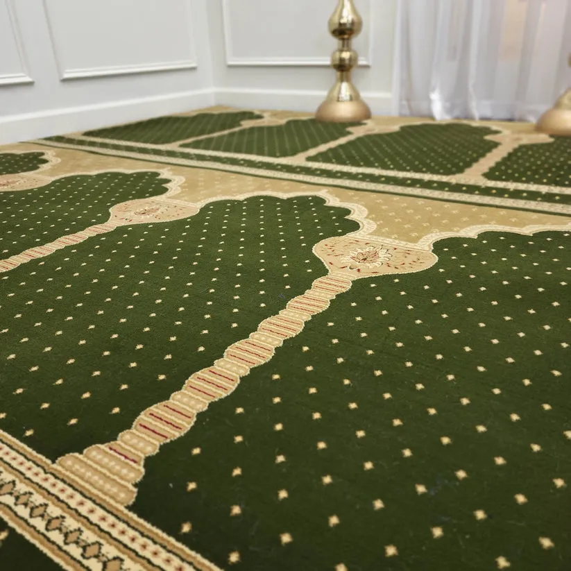 The Luxury Olive Green with Gold Mosque & Masjid Carpet combines elegance and safety for any prayer space. Its rich olive green base and gold mosque motifs create a striking yet serene environment. Crafted from 100% heat-set polypropylene, the carpet ensures long-lasting durability and a soft, comfortable feel underfoot. With a 14mm pile height and 880,000 knots per square meter, it provides dense, premium texture suitable for high-traffic mosque areas. The carpet is fire-rated under CFR 16 Part 1630/1631, giving you peace of mind and compliance for building inspections. Backed with jute and engineered with a 9360 pile density, it guarantees structural strength for years. Easy purchasing by square feet ensures flexibility for any hall size. Its timeless design balances aesthetic beauty with functional performance for mosques and prayer areas.