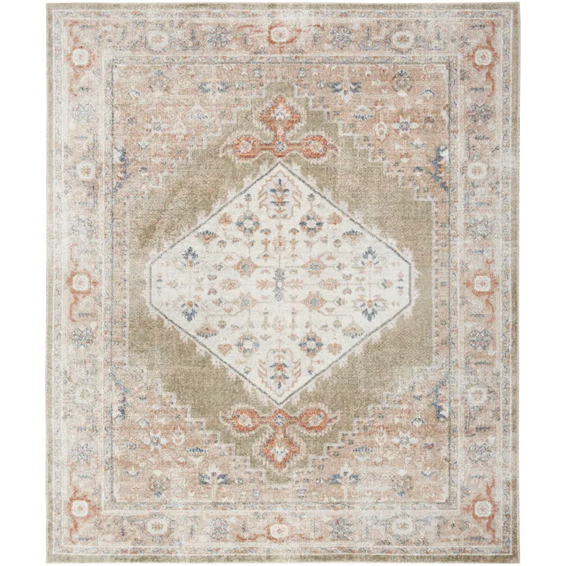 The Millyr Washable Oriental Indoor Rug combines classic Persian design with modern convenience. Its faded floral medallion pattern in sage green multicolor adds elegance to any room. The soft, velvety polyester surface provides a luxurious feel underfoot. Finished with a subtle sheen, the rug shifts beautifully under changing light. Designed for busy households, it is machine-washable, stain-resistant, and water-resistant. This rug is durable and pet-friendly, with non-pilling and fray-resistant construction. The machine-woven technique ensures consistent quality and long-lasting performance. Ideal for indoor spaces, it adds style and practicality to living rooms, bedrooms, and play areas.