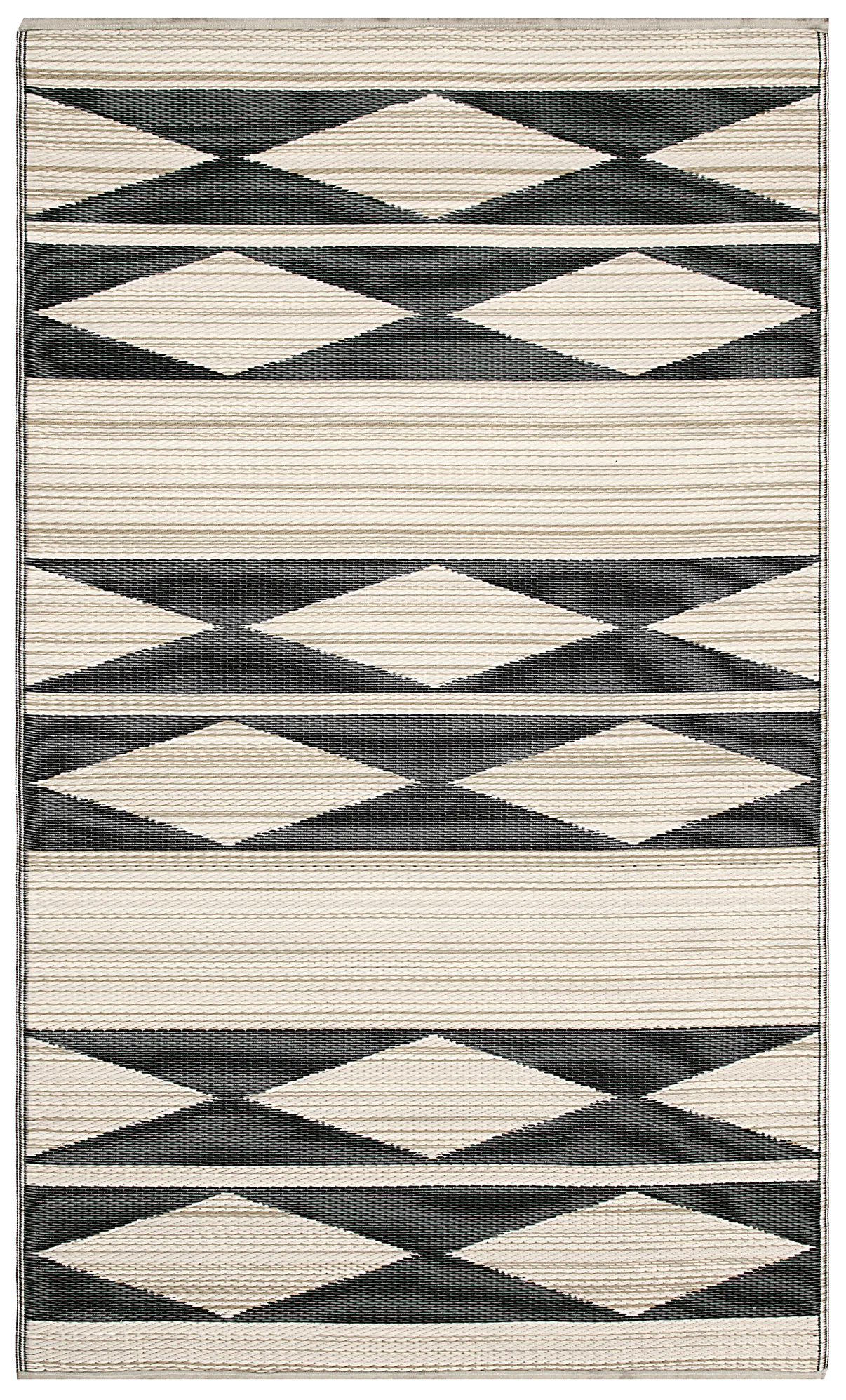Outdoor rugs with a natural and black geometric pattern add bold, modern style to patios, decks, or balconies. Clean lines complement eclectic to contemporary decor while maintaining durability and outdoor functionality.